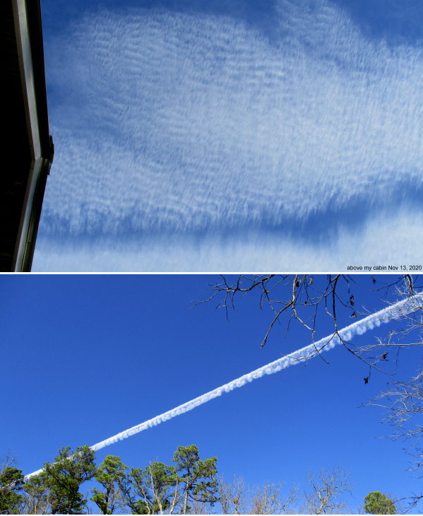 Nov 13 (Friday), 2020: (1:50pm) Weird blurry ripple-smear above cabin for hours this morning. Then it mostly cleared off so they laid this distinctive trail.
