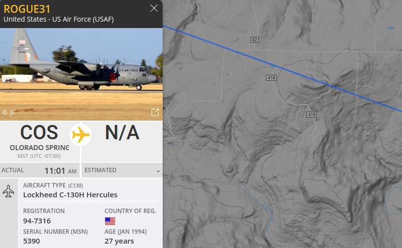 (11:50am) Sunny with chem. I have been getting more mysterious off-radar planes including a very loud jet a while ago, and another fairly close just now. Yesterday a USAF C-130 came by noisily. Then shortly ago, these 2 more. I have some doubts about the accuracy of the flight paths shown on flightradar24. I was outside, and it appeared to me that they came right over my property, but flightradar shows their path as being 2km south!