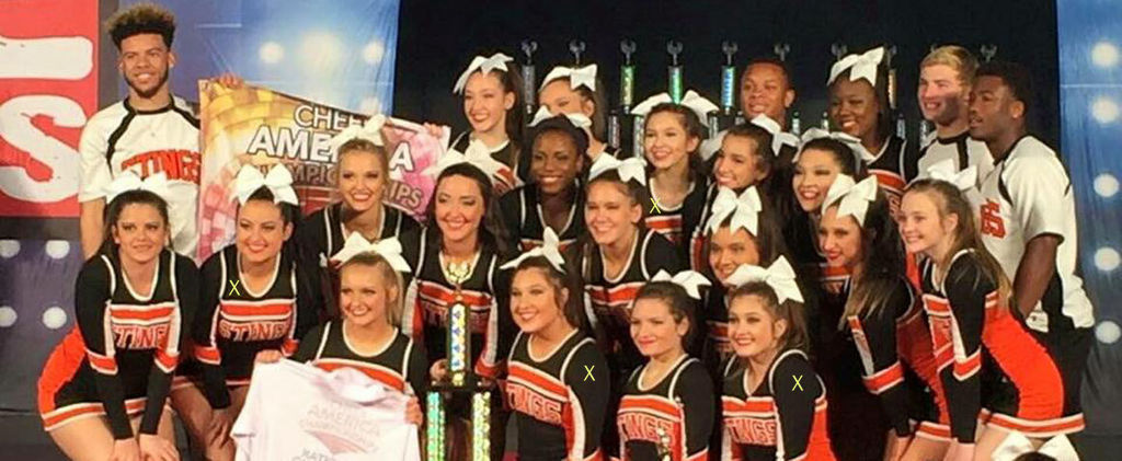 But, what is up with these cheerleaders? Why do some of them have identical faces? I marked with a yellow X 3 near bottom who seem the same. Also another further up who could be the same with a cheek smudge added. And some of the other girls look similar to her or to each other. Not that it's the sharpest pic.