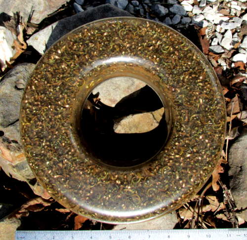 Mar 7, '18: (1:55pm) Here's my latest anti-AI device. I did the last pour yesterday morning. Late afternoon (after it was largely set up but still stuck in the mold) i realized it doesn't do much unless it is sitting right-side-up. As soon as i set it upright, it seriously weakened the AI attacks i was getting, which had been causing nausea as well as upper back / neck pain.