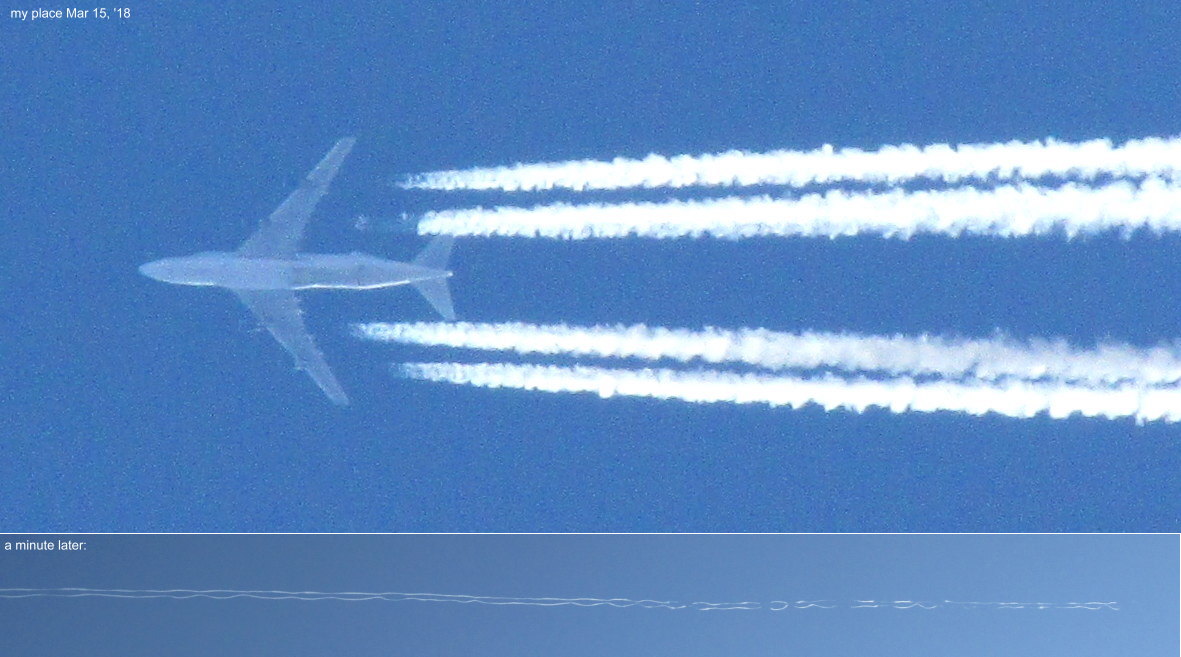 A short while ago a somewhat translucent-seeming one came over spraying unusually thickly. But the trail vanished right away.