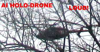 (5:10pm) Generally, attacks are getting weaker, but just a few minutes ago a real loud and realistic AI drone chopper came over my cabin. I ran out and hastily snapped pix; best i could do. Traces to CIA AI#1 in the Canopus area. Canopus was attacking me earlier today too.