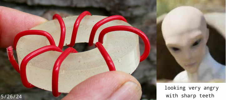 The reader who alerted me to those "gremlin" ETs mentioned on the 5th (who is also the TI in Koge) wrote me that he keeps "seeing" some ETs that resemble this pic he got off the web. I made this device to light them up. It is an epoxy ring i made many years ago, and wrapped a wire around it today.