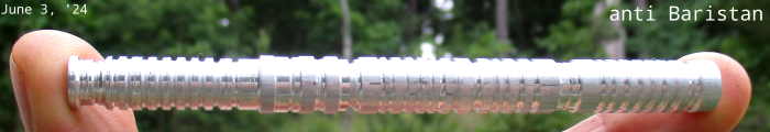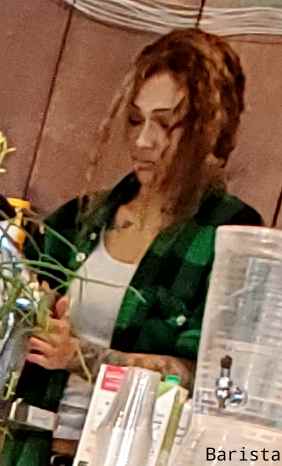 June 3, '24: (4:15pm) Joe sent me this pic: "New worker at the coffee shop I frequent. Has significant glass eye syndrome (just those real fake looking eyes) and a bizarre vibe."