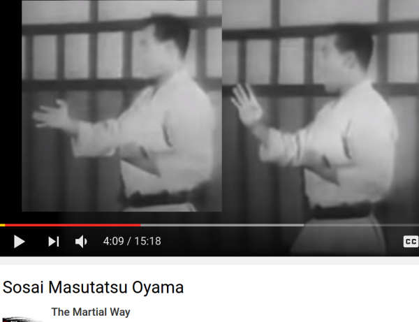 And in this video, you can see legendary Karate master Mas O Nick Mas Oyama, founder of Kyokushin, doing a kata while doing beaucoup Masonic M hand signs.